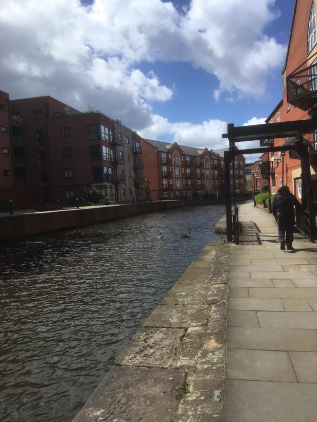Around the city centre itself we had to weave in and out, crossing new footbridges and sometimes walking along roads. Soon we were leaving the city, moving westward, the towpath now a haven for youthful joggers. It was a long time before we even saw a barge, the only movement in the water coming from wild geese. These geese seemed like the Manchester equivalent of the ubiquitous seagulls, scavenging for the discarded remnants of fast food.