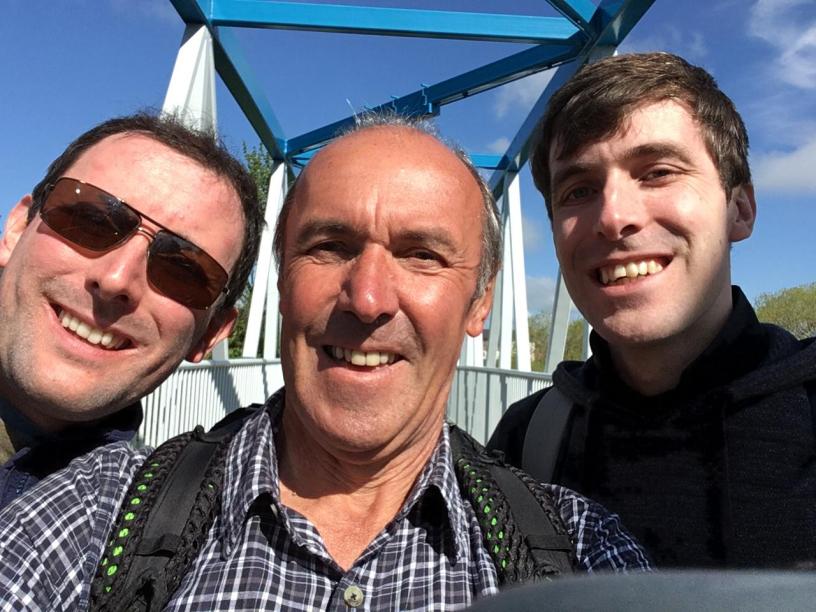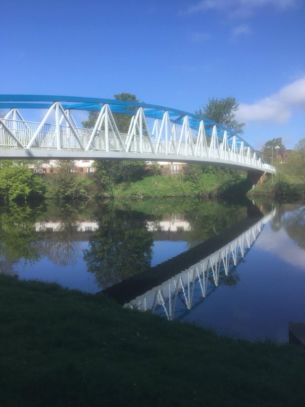 My son, Anthony, drove to Thornhill yesterday evening, left his car there, then took the bus to Dumfries to join Peter and I. The three of us set off together at 10am this morning for the walk to Thornhill. Ian, the proprietor of our B&B, described a shortcut using a path along the south bank of the River Nith which would allow us to bypass the traffic in the town centre. We decided to take advantage of his local knowledge and soon found ourselves crossing the river on a modern footbridge.