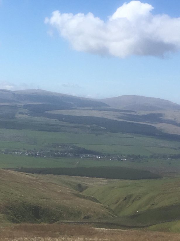 My walk started at the A76 main road then crossed over the railway line, following a quiet country road for about 6 miles. The road presented me with a gradual climb, taking 4 miles to get to the highest point of the day, 1,522 feet. Sanquhar, like many of its neighbours on the A76, used to be a mining town. The mines closed down long ago but 2 large pit bings (spoil heaps) were clearly visible from my elevated walk. If that was a reminder of old energy then the symbol of new energy was visible in every direction – wind generators! They dominated the landscape for miles around, as they seem to do everywhere in the South-West of Scotland. Will they be the pit bings of the future, I wonder? The views along the length of the Nith Valley were breathtaking with hills that I know and walk coming into vision.