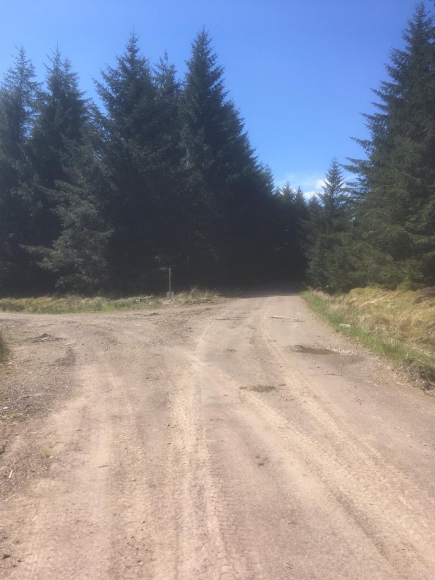 After rounding Glenguffock Hill the road finally came to an end, after 6 miles, at Fingland. Here, I followed a track which was to take me from Nithsdale, into a coniferous forest, then finally to the valley of the River Ayr. The walking, up to and including the forest, was excellent. The track going round Stony Hill, after leaving the woods, was horrible, for about a mile anyway. It was wet, boggy and muddy. Heavy duty forestry vehicles had obviously used it for access, churning up the soft ground and making it a quagmire in places. The hot weather was slowing me up a bit by this stage too.