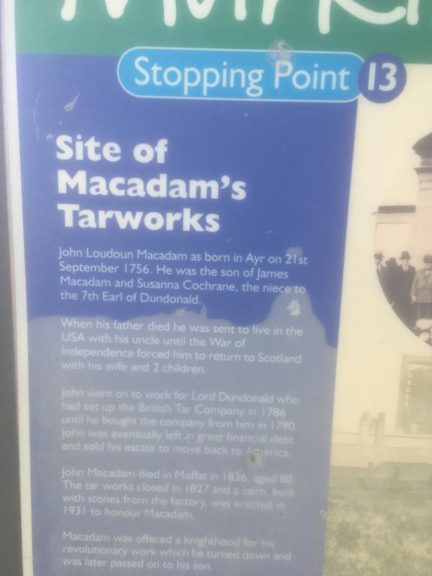 After a while the track became solid again and continued like that all the way to Muirkirk. Near the end, I passed Macadam’s Cairn, which commemorates John Macadam, the famous roadmaker, whose name lives on in ‘ Tar Macadam ’.