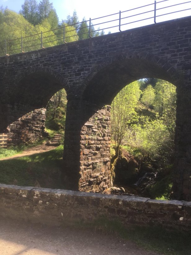 Suitably refreshed, we followed well-defined paths for the rest of the day. After Inverarnan we walked along Glen Falloch tracking the river valley and passing the Falls of Falloch waterfall. By now Loch Lomond was a distant memory as we made our way towards Crianlarich. The temperature was well in to the 20s with no breeze. We crossed underneath the main road to now follow the old military road.
