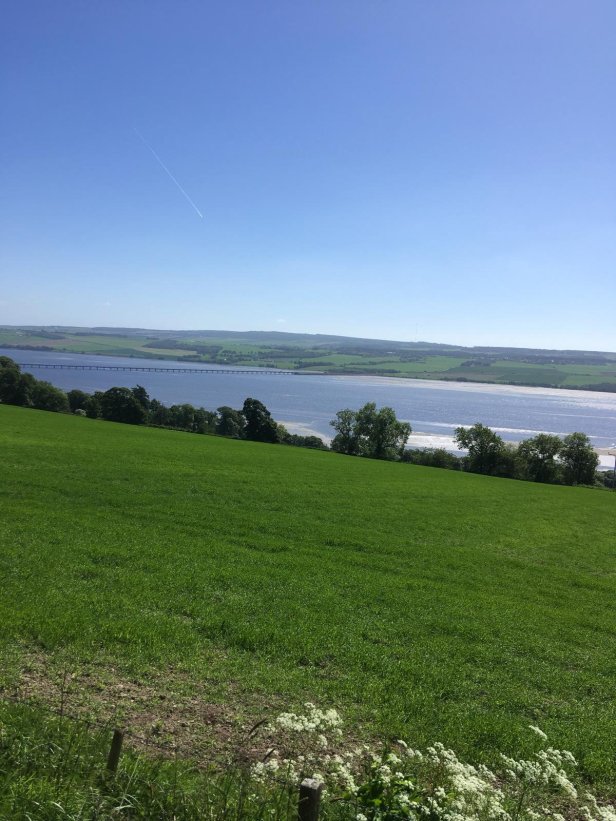 Dingwall seemed smaller than I expected. That might be because I entered it near the Cromarty Firth side and possibly didn’t have occasion to go into the main body of the town. I can’t say for certain. This morning I first crossed the river, then the railway line, then the A862 main road before heading uphill passing some nice houses to reach a country road. Turning right on to this road provided me with the bulk of today’s walk. Like yesterday I was following National Cycle Route 1. The road was a good deal busier than I would have liked. I had taken the precaution of wearing my Hi-Vis waistcoat and was pleased at having made the right decision. The slight climb gave me some wide views of the Cromarty Firth with the unmistakable Cromarty Road Bridge, carrying the A9, getting ever closer as I progressed.