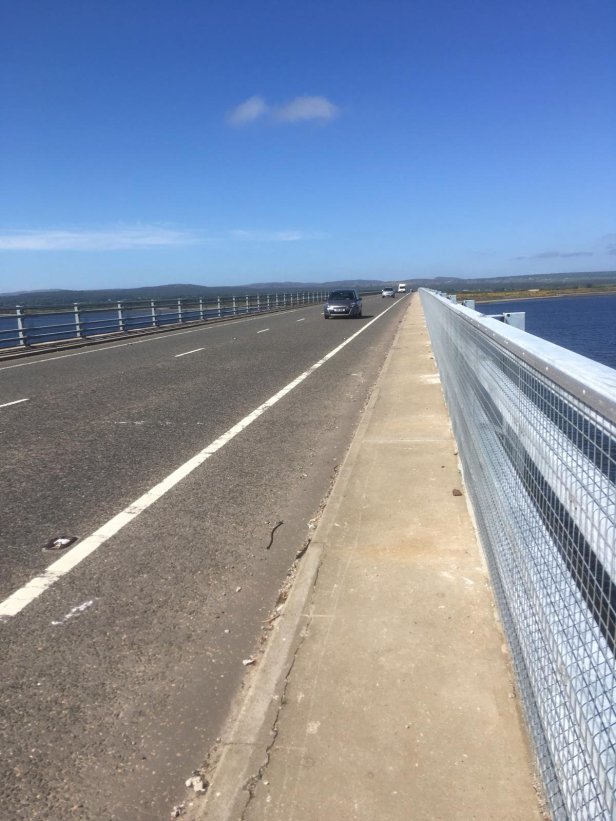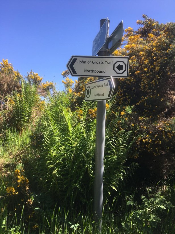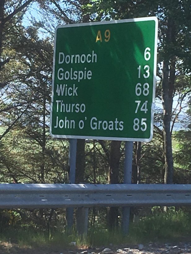 My route ahead, the Dornoch Firth Bridge, was visible from a long way off. The first road sign with John o’Groats on it lifted my spirits a little. When I eventually started to cross the bridge the breeze turned into a strong wind trying to push me off the tiny pavement on to the road. On reaching the other side of the firth I discovered I had left Ross and Cromarty and was now in the County of Sutherland. I spotted a path shortcut through a field and a couple of gates that allowed me to leave the A9 and join a long, straight country road which took me all the way to Dornoch.