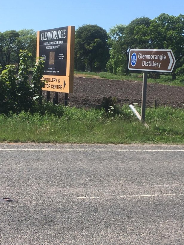 Tain was bigger than we both expected but had a charming village feel to it. I joined Pete for a seat and a pint before setting off on my own for the rest of the walk. Leaving Tain, I now joined the main road north, the A9. For the first time there were no separate cycle path/walkways shadowing the road. My path was along the grass verge or narrow gravelled area next to the road itself. This was not fun… but I suppose I am just going to have to get used to it. I walked through Glen Morangie and, of course, the entrance to the eponymous whisky distillery.