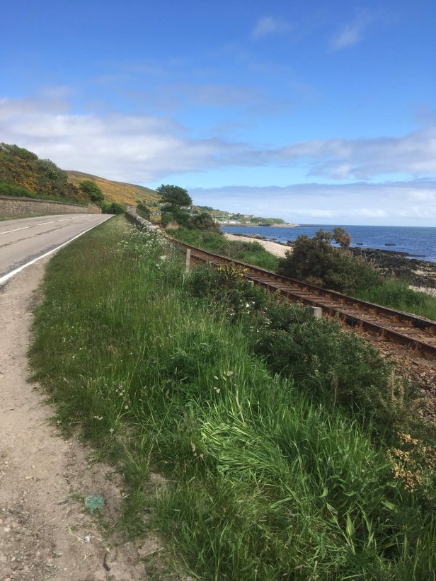 At the far end of the golf course my plotted route was back to A9 roadwalking. However, there was still some path alongside the beach, so we decided to take a chance and see how far we could go before being forced on to the road. We persevered with a mixture of path, sand, shingle and rocks before finally admitting defeat at Kintradwell. The railway line was between us and the road so I had to phone the signalman to get clearance to cross the tracks. Then it was a steep farm path to join the A9.