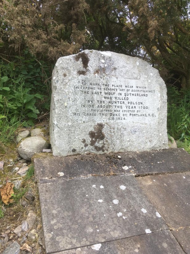 We passed a monument, on the other side of the road, at the place where the last wolf in Sutherland was killed around 1700. Coming into Helmsdale we also passed a large modern statue commemorating the Highland Clearances – when many people were evicted from their homes, most notoriously by the Duke of Sutherland, to make way for sheep. Helmsdale is actually a product of the Clearances, being constructed to house some of those evicted. The Strath of Kildonan, near Helmsdale suffered severe depopulation, and many of those evicted decided to emigrate. It was emigrants from Kildonan who founded the city of Winnipeg in Manitoba, Canada.