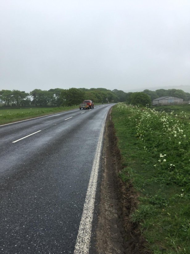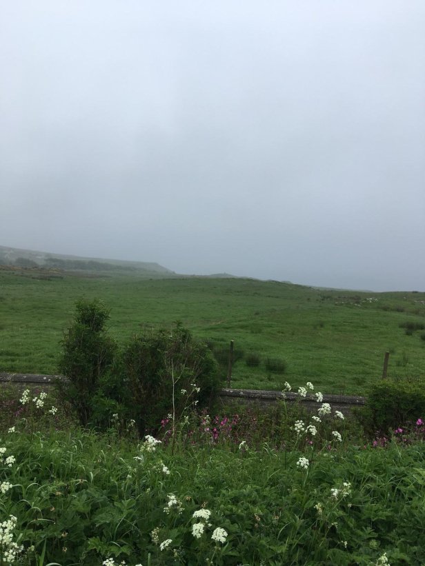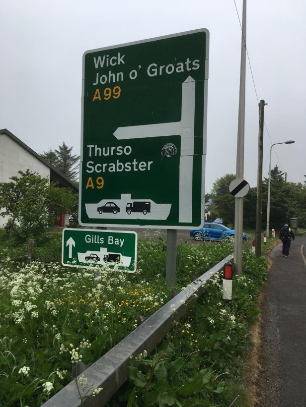 Pete was staying at a different B&B from me. We met at 9am for a sensible start. For once there was a dampness in the air. It wasn’t quite rain, it was low cloud/mist. Although it wasn’t annoying enough to require me to put on my jacket, it did leave everything covered in a film of wetness. The major problem with this was that all the vegetation was correspondingly wet. My route today was main road, the A9 then the A99, so constantly having to avoid traffic meant jumping on to the grass verge then back to the road and so on, all walk long. With the verge being so wet, I was soaking virtually from the start. The bottom of my walking trousers got wet, my boots got wet and, much more importantly, my socks got wet. For the first time on my walk I was walking in wet socks for the whole day. Of course, it would happen on a long day.