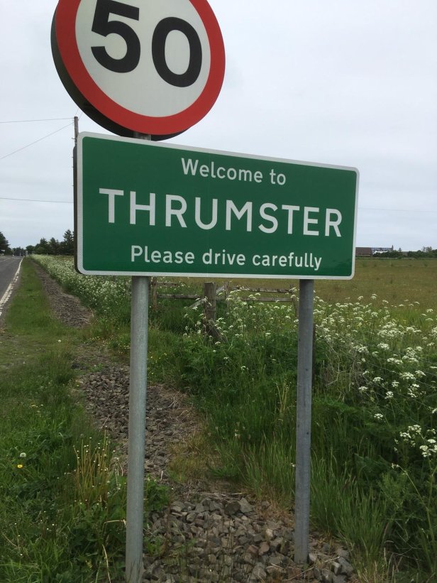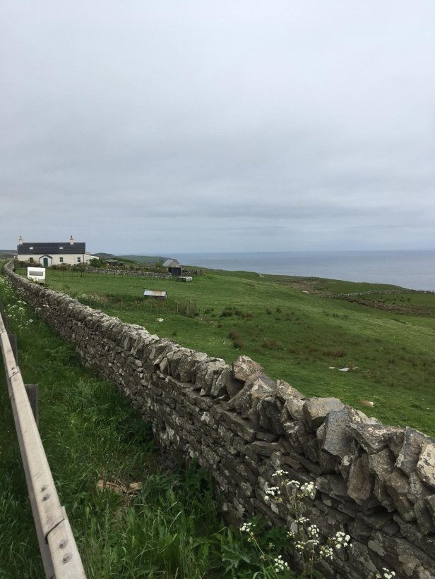 The road stayed quite close to the coast as I passed through Overton, Mid Clyth, Ulbster then Thrumster. The landscape didn’t vary much as I tramped the miles, jumping from verge to road and back again. The grass dried up by around midday, as did my trousers… but, sadly, not my socks! Trees were few and far between, as I had expected, which offered no variety to the surroundings of houses and fields. As the weather cleared up I had good views out to sea, making me aware of the many oil and gas platforms located offshore.