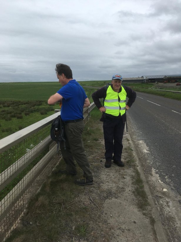 By this point I had started getting texts on my phone as friends realised that I must be near the finish. I know this will sound really corny, but, when I saw the road sign before entering John o’Groats I must admit to having a lump in my throat and a tear in my eye at the realisation that this was the last act of many years of thought and 6 solid months of planning and walking. Until that moment it hadn’t occurred to me that I might get emotional. We still had a mile to go before arriving at the marker signpost. The sun was out, we’d had another dry, warm day, visibility was excellent and the three of us had walked 17 miles of road – my weather luck had been with me to the end.