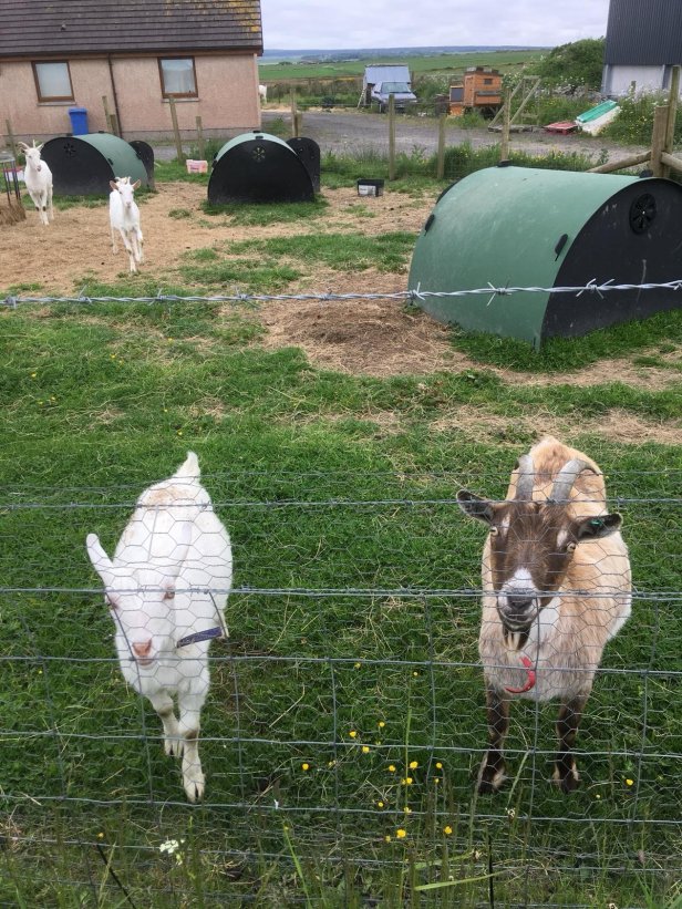 The road then climbed a little to the compact village of Keiss, which was big enough to have a pedestrian crossing, complete with amber warning lights, on its main road. Pete wanted to stop and change his walking boots for shoes so I was hoping to find a cafe or park bench in the village to let us stop for a break. Absolutely nothing of any help was there. As we were passing the last house, with a B&B sign in the window, a man was standing on the pavement with a mug of tea in his hand, talking to somebody out-of-sight in the doorway. He started talking to us as we reached him, and, on discovering that we were walking Lands End to John o’Groats he offered us a mug of tea and a seat. The sun was breaking through the clouds as he and his wife brought us out 3 lovely mugs of tea while we sat and chatted in their garden… with Pete grabbing the opportunity to change his footwear. There was never any question of payment for the hospitality and we would never have insulted them by offering. For me, it shows that, even in this modern world, you can come across generosity when you’re least expecting it. To Annette and Frankie, thank you very much for sharing some time with strangers, it was one of the highlights of my walk. Poor Annette had to be dragged back outside for some photos before we left.