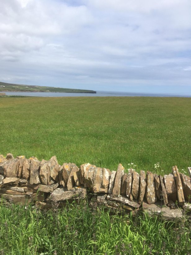 We met at 9.15am, deposited our heavier bags in the boot of the car, and set off for John o’Groats. It would have been difficult to get lost today because the route was main road, the A99, from first step to last. There was a generous length of pavement which offered us safe walking out of town, past the industrial estate, then along a stretch of country road, before it came to an end. ‘ Wick John o’Groats Airport ’ was on our right-hand side as we followed the A99 away from the buildings. I don’t know how busy it normally is but we saw a couple of planes land during our brief brush with it. Our road was always very close to the coast, curving round the large body of water called Sinclair’s Bay. Someone told us that it is very popular with surfers, although it looked calm and unthreatening from our vantage point.